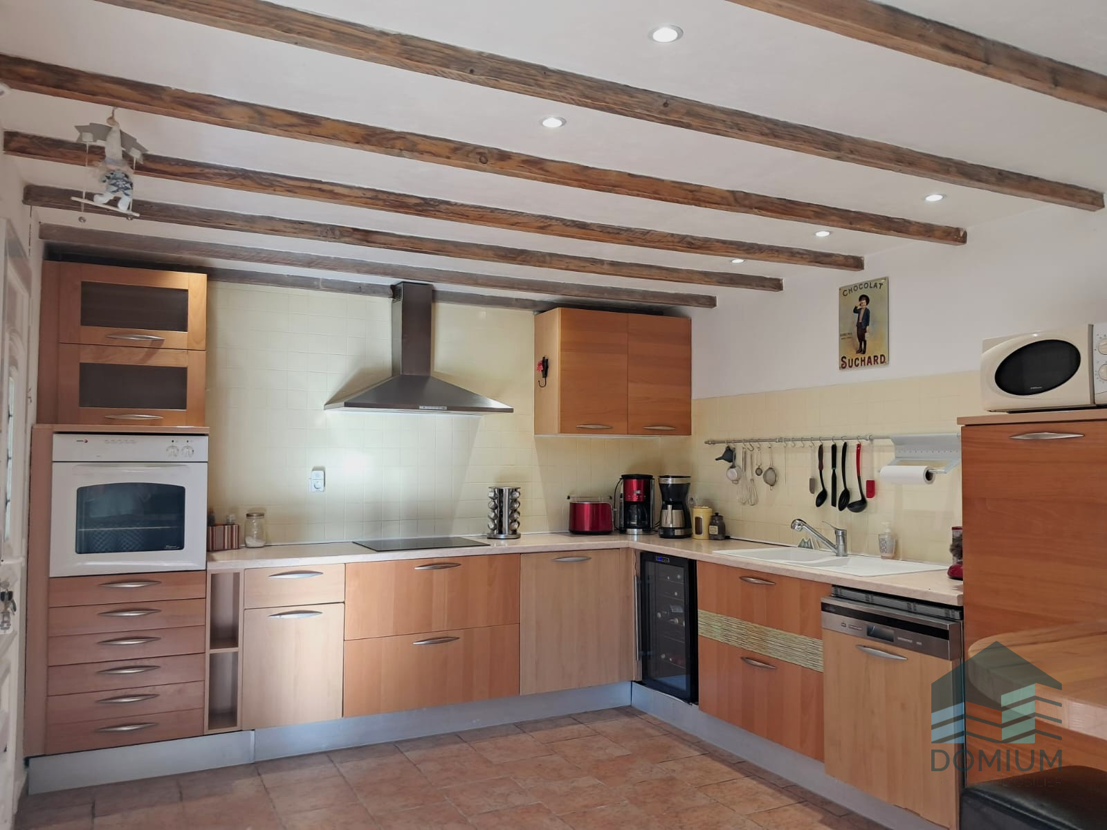 Au premier étage, un beau salon, où trône la cheminée, se remplit de lumière et s'ouvre sur un balcon. Dans la continuité, la cuisine aménagée, équipée, jolie et sobre.